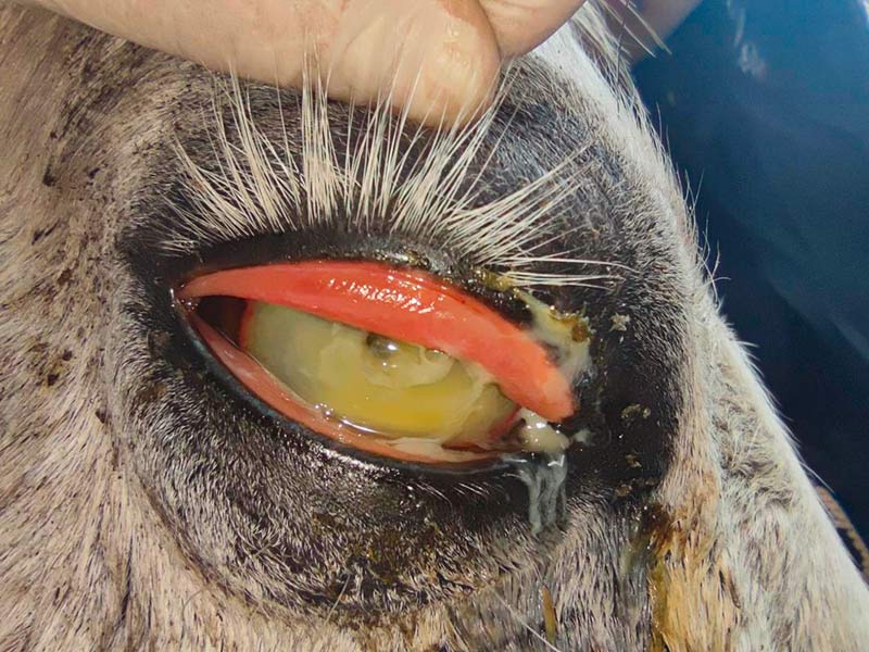 Entre los signos clínicos más frecuentes se incluyen el dolor ocular (evidenciado por blefaroespasmo, lagrimeo excesivo o frotamiento del ojo), la fotofobia (intolerancia a la luz), el enrojecimiento conjuntival y episcleral, y la disminución de la visión. También pueden observarse miosis (contracción de la pupila), disminución de la presión intraocular, y en casos avanzados, la presencia de precipitados queráticos en la córnea o proteínas y células inflamatorias en el humor acuoso (flare o turbidez en la cámara anterior).